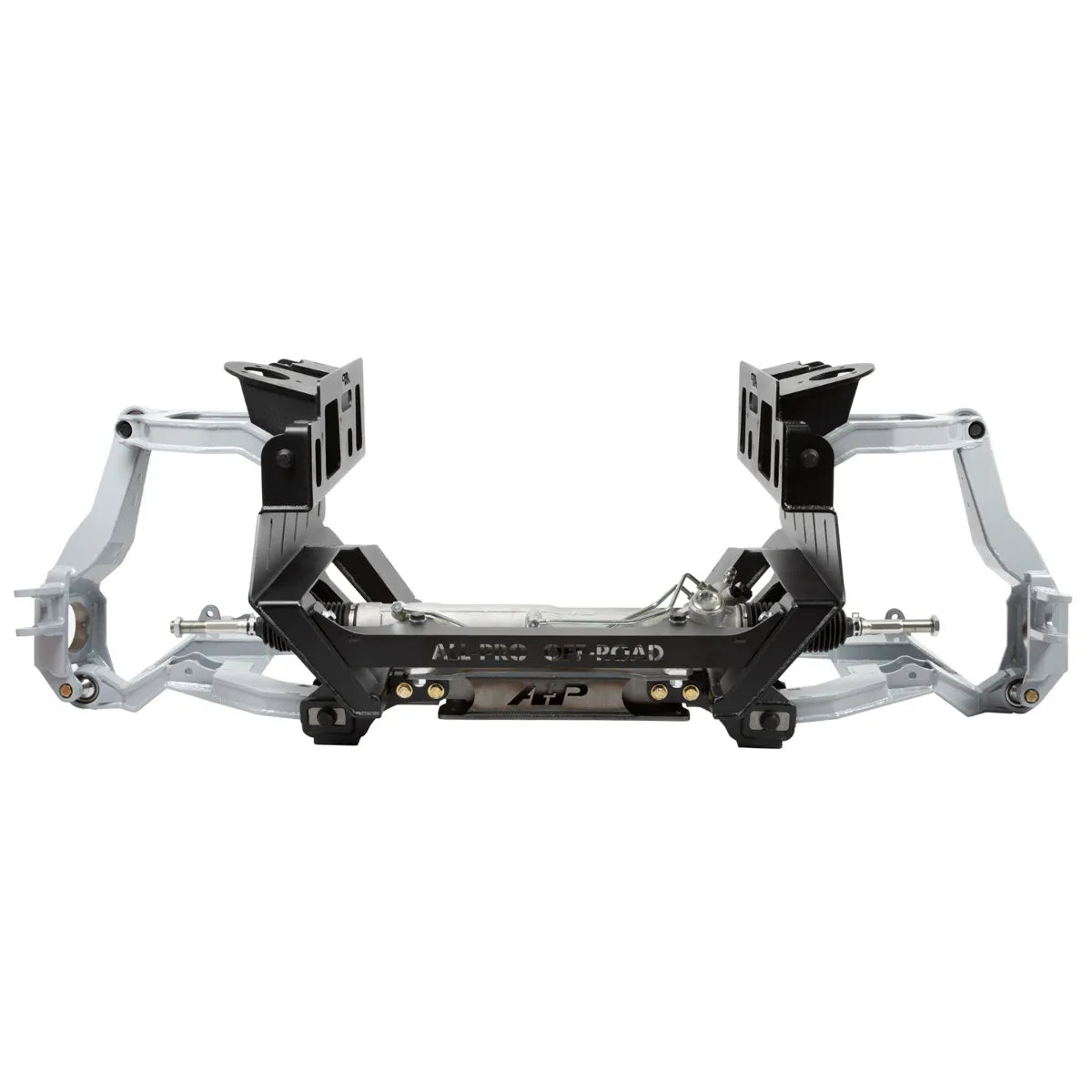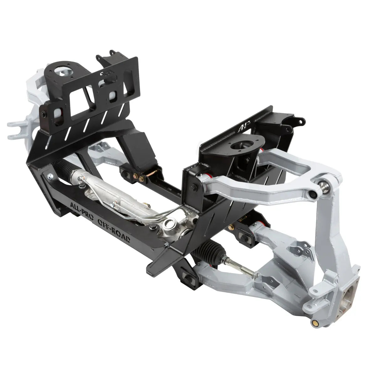 All-Pro Off-Road is proud to release the first comprehensive long travel solution for the Toyota Tacoma. Our Modular Long Travel (MLT) kit replaces the entire IFS suspension and differential mount on your Tacoma, giving you 15 inches of unrestricted wheel travel (13.5 inches with our recommended setup of King TC5119-03 coilovers, 23” limit straps, & Superbumps) and superior durability, along with the ability to run up to 42” tires! How do we do this? Our patent pending bulkhead system replaces the weak crossmember, suspension mounts, and stock steering rack with a heavy-duty module that can be moved up to 4” forward of the stock location, allowing the suspension and steering to move as a single unit, which means that the ideal steering geometry never changes, and bump steer is almost completely eliminated.