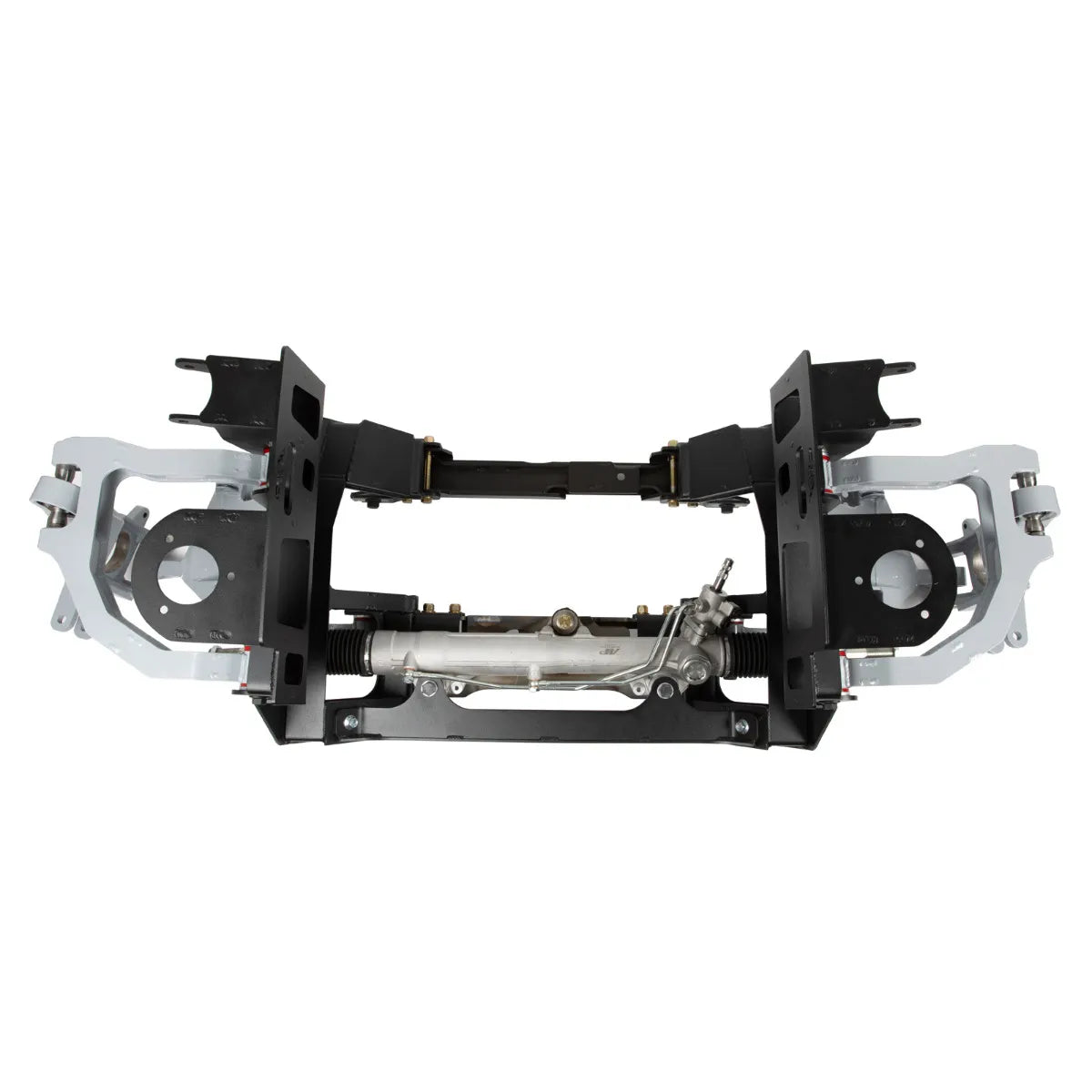 The high-clearance uniball lower control arm and the upper A-arm are fully boxed for strength under the most grueling off-road conditions and adds 3.5 inches of width on either side. The spindle wheel mount surface is fully machined from forged 1020 steel and the entire spindle is boxed with double-shear mounts for chromoly rod ends. The crossmembers are fabricated from 3/16” thick steel and incorporate 3-point mounting for the steering rack.
