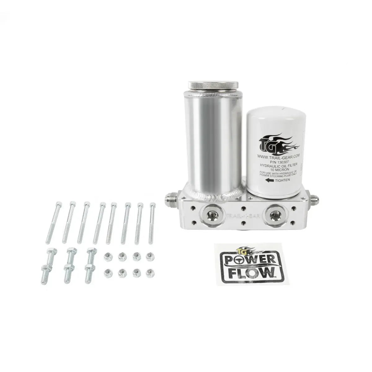➤ Choice of 4-cyl or V6 Power Steering System with heavy-duty Power Flow LC200 steering rack, Power Flow 1650 psi pump, Trail-Gear Filter Reservoir, high-flow cooler with ½” ID copper tubing, hoses, brackets, and hardware.