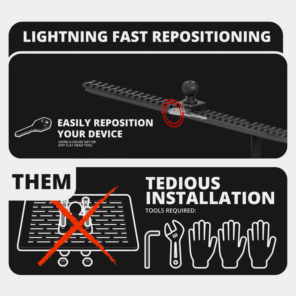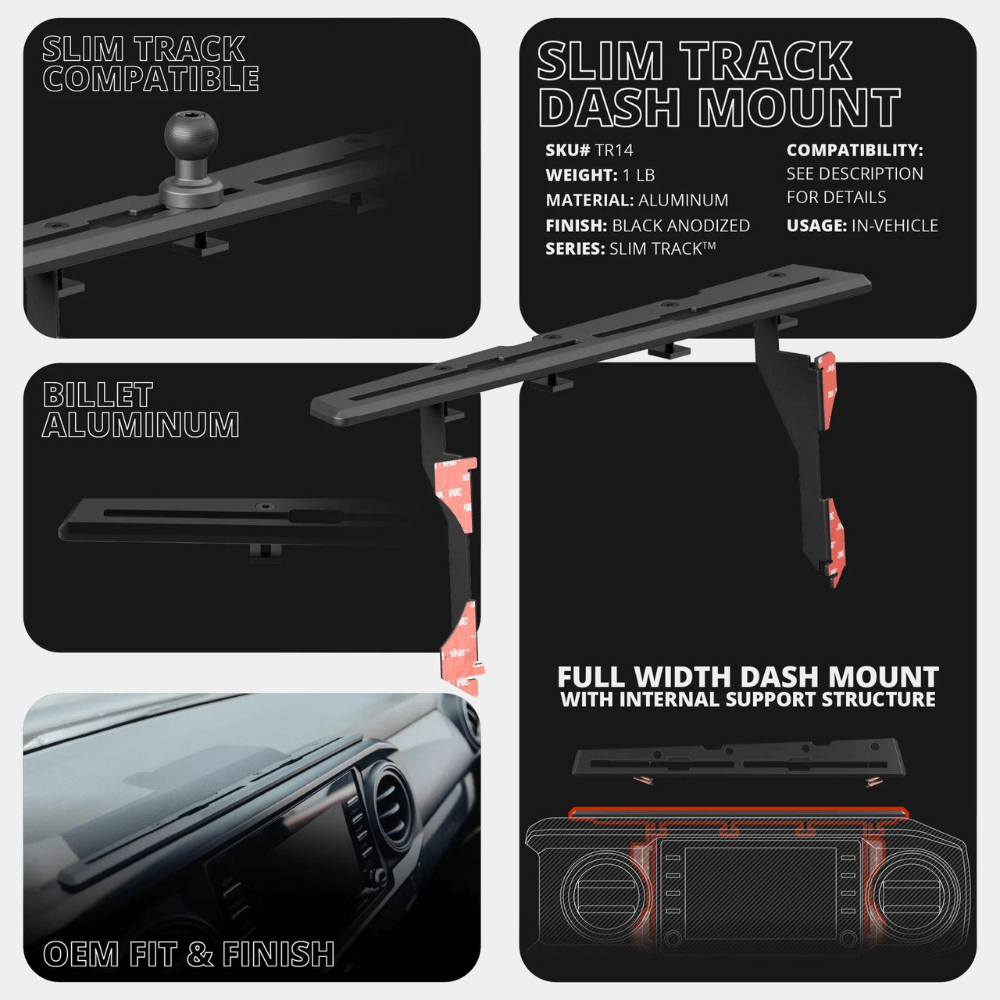 TACOMA SLIM TRACK DASH BRACKET: Upgrade your 3rd Gen Toyota Tacoma (2016-2023) with the most rugged and dependable ALL-METAL dash mounted phone mount setup on the market. Engineered to meet the demands of both on-and off-road drivers, each Tacoma dash kit is built from high-grade 6061-T6 aluminum and CNC machined for enhanced strength and durability. Using laser scanning technology, our dash brackets are precisely designed to match the complex contours of your dashboard, while the hardcoat anodized finish provides an OEM look and feel, seamlessly blending with your vehicle's interior.