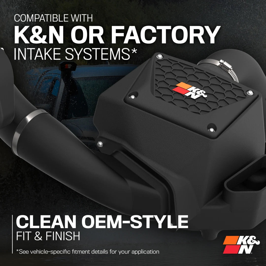 K&N’s all-new Snorkel System is built to deliver added protection and confidence when heading off-road and into extreme environments. Proudly designed and manufactured in the USA, this system helps ensure a consistent supply of cleaner air to your engine, especially in dusty, sandy, or debris-heavy conditions. By relocating the air inlet to the vehicle’s highest point, K&N snorkels help preserve airflow, enhance induction tone, and reduce the risk of water ingestion* (Not rated for complete water submersion). The one-piece, roto-molded construction offers a durable, integrated appearance and is designed to fit either the factory, K&N or Airaid cold air intake system.