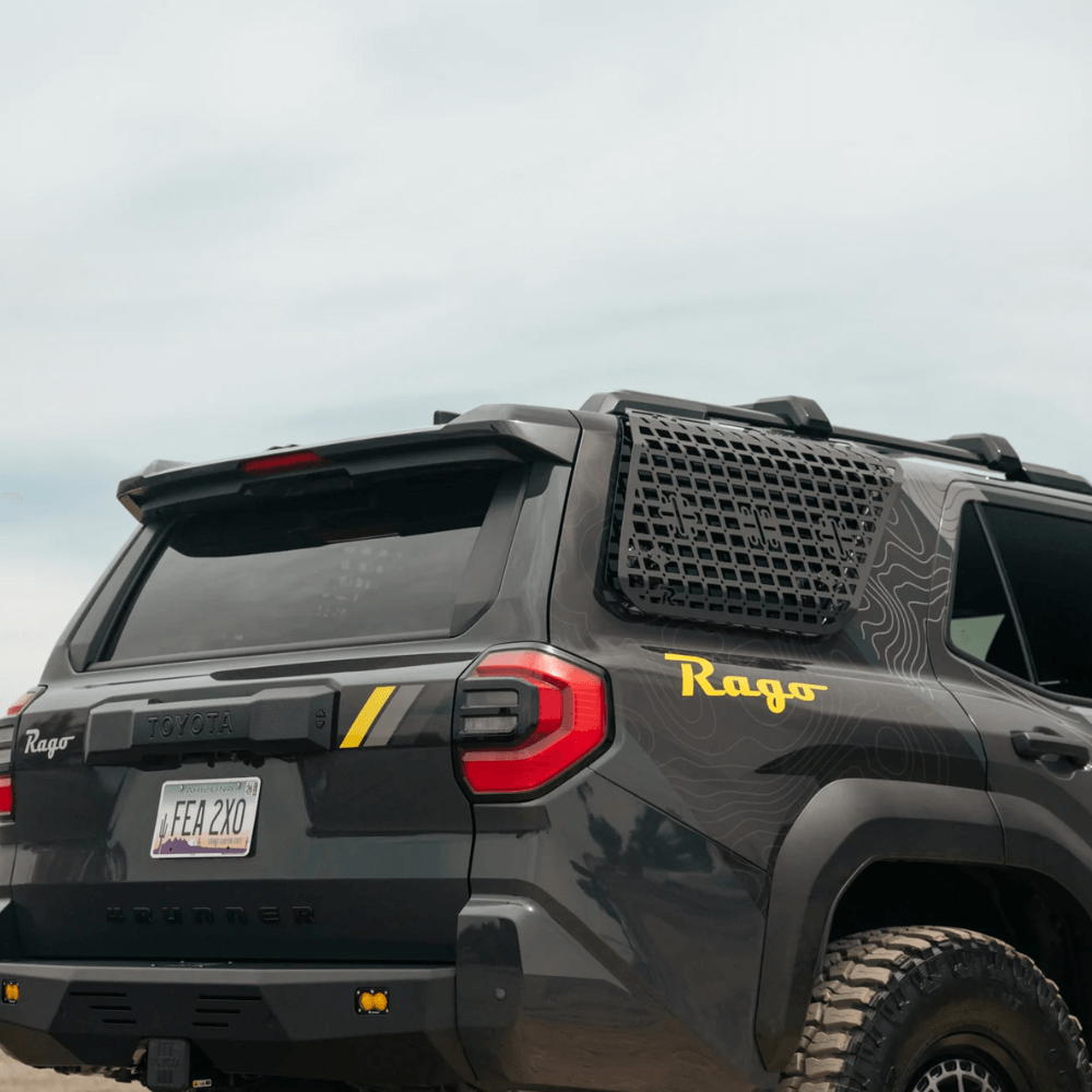 The E-MSPs are made from durable steel, and are finished in a sleek dual-stage hammer black powder coat that complements your 4Runner’s exterior styling. The tops of our panels install to the factory roof rails or Rago’s Crossmembers, and the bottoms secure to the rear windows with the included heavy-duty RAM Mount Suction Cups.