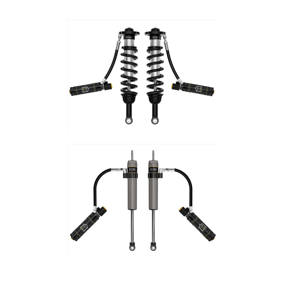 ICON Vehicle Dynamics V.S. 2.5 Series remote reservoir CDEV front coilover shocks are an incredible upgrade for the front end of the 2025 Toyota 4Runner. These adjustable coilovers allow up 1.25-3” of lift height adjustability, allowing the use of larger, more aggressive wheel and tire combinations. ICON’s Vehicle-specific shock length and valving, their large 2.5” shock body with increased piston surface area over stock components, and their pairing with an ICON front differential drop on 4WD models, yield the maximum travel possible along with superior ride quality and suspension performance both on- and off-road. Remote reservoirs greatly increase shock oil volume and heat dissipation surface area to resist overheating and cavitation under hard use, which can lead to damper fade. The ICON CDE Valve upgrade is included for those desiring an easy way to tune the ride electronically from inside the vehicle. Compression Damping Electronic Valve (CDEV) is an electronically controlled valve that meters the flow of oil to regulate the amount of damping force that is created by the shock when compressed. This infinitely variable valve can react in less than 40ms and has the ability to make extremely precise adjustments for varying terrain. CDEV's hydraulic circuits are also custom tailored per application to create the highest resolution and dynamic range allowable for each specific vehicle.