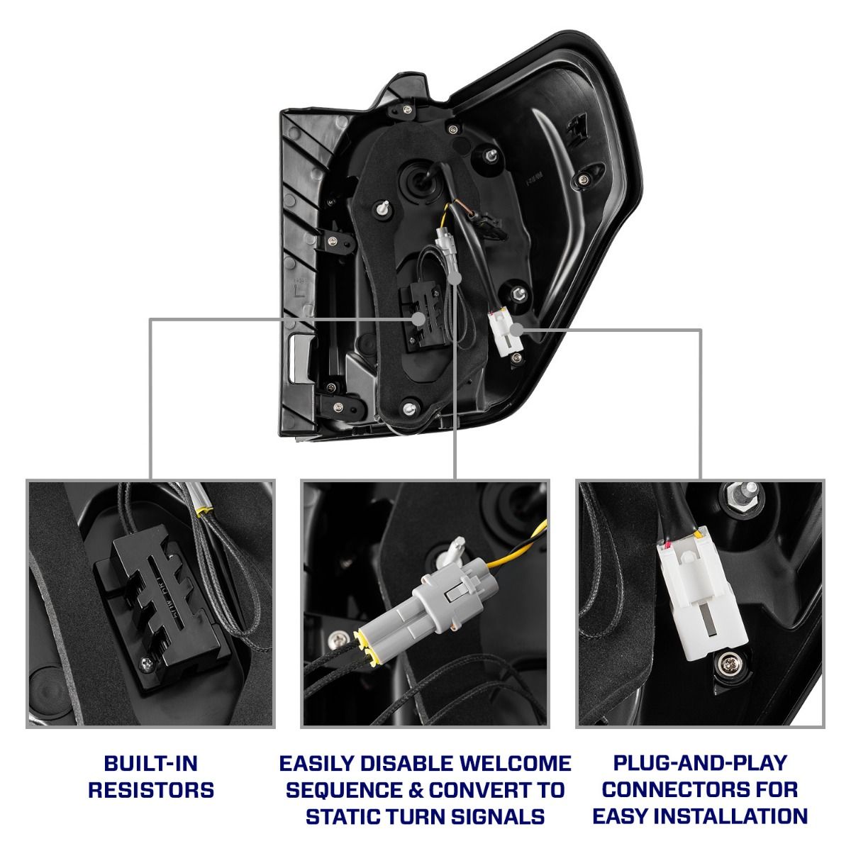 Sequential Turn Signal. The startup sequence won’t be the only thing turning heads. These tail lights also feature a sequential LED turn signal. Any time the turn signal is activated, the three inner bars will illuminate in a smooth sweeping motion outward, for a truly premium look. If you prefer, you can disable the sequential feature entirely for a clean, static turn signal. Simply plug or unplug the appropriate connector on the back of the lamp.