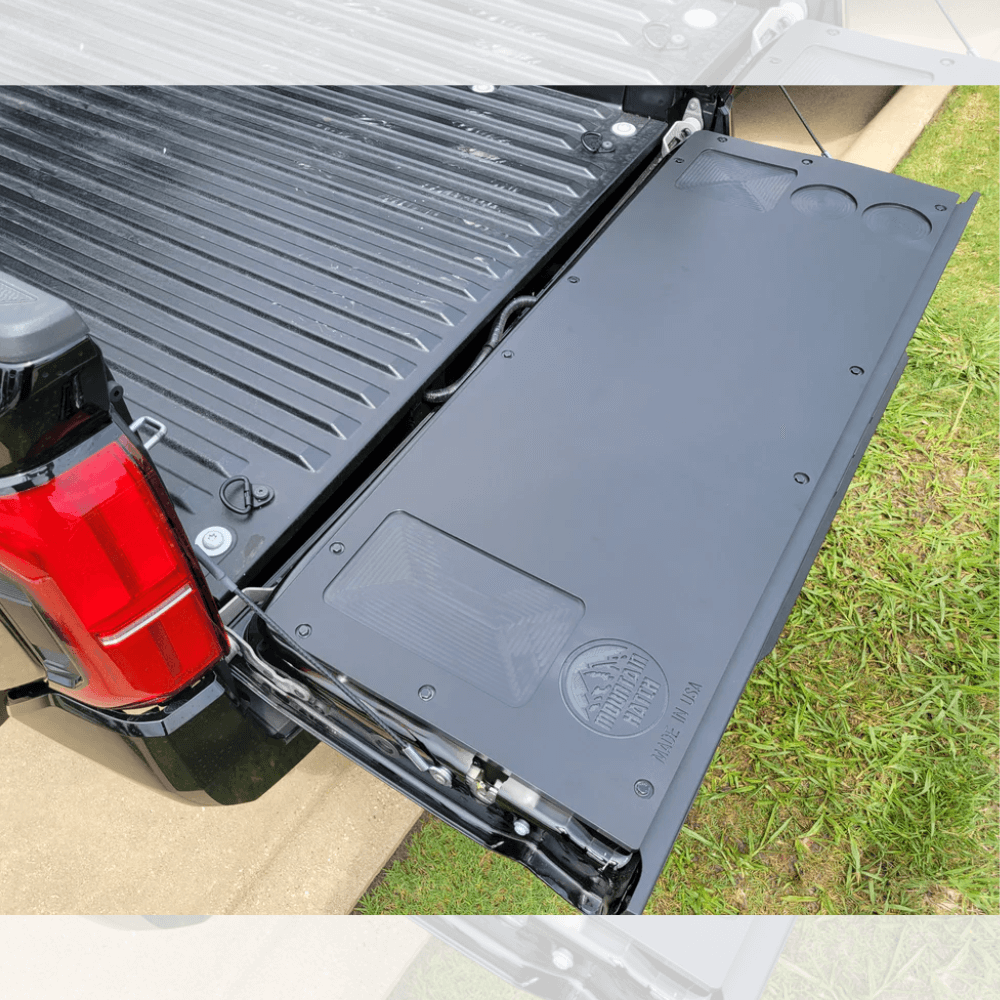 The Mountain Hatch replaces your Toyota Tacoma's OEM tailgate panel to give you a much flatter surface. Now your Tacoma tailgate can serve as table whether tailgating, camping or if just want to set that hot cocoa down. This product is a heavy-duty FDA approved 1/2 inch hdpe with UV inhibitors. Like a cutting board, it is also food safe. Just remove your Toyota Tacoma's factory screws, remove OEM panel and replace with "THE Mountain Hatch" panel which you hand tighten only. The Mountain Hatch is made right here in the USA. Your Tacoma tailgate will never be the same. Patent D929307