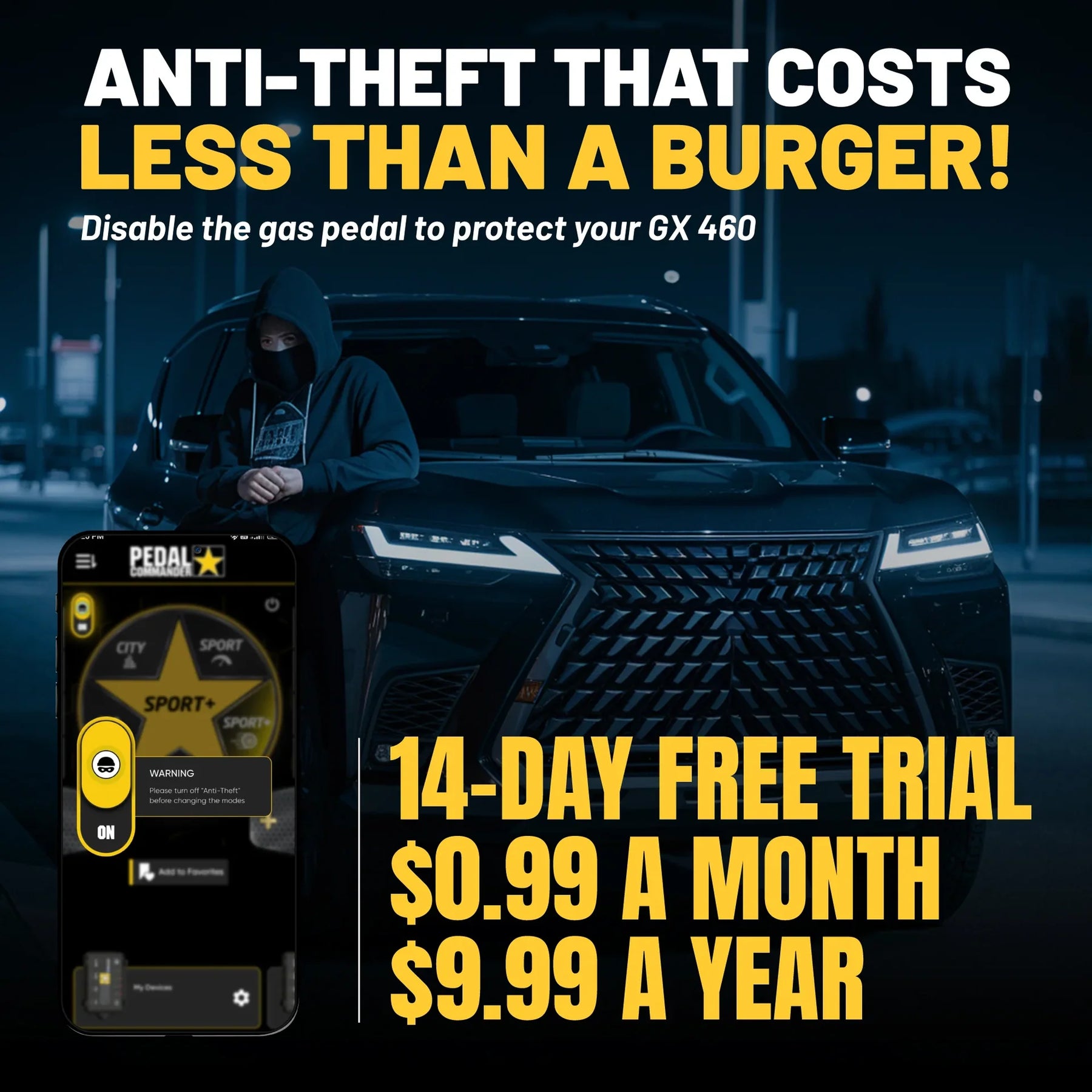 Meet the Pedal Commander® throttle response controller, the best upgrade for Lexus GX. Pedal Commander® is the ultimate solution for throttle lag. It instantly improves your GX's performance by eliminating the unwelcome throttle lag. With its fully customizable 4 driving modes, you can get better traction off the road, faster acceleration on the road, or improved fuel economy on your daily drives. Plus, you can subscribe and activate the Anti-Theft mode and add another layer of security to your GX with Pedal Commander®!