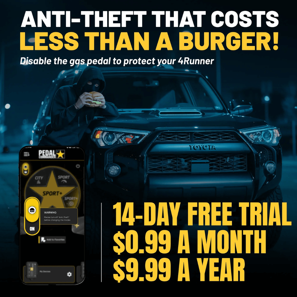 Get rid of the unwelcome throttle lag of the drive-by-wire gas pedal with the Pedal Commander® throttle response controller for Toyota 4Runner. Control your off-roader’s gas pedal with Pedal Commander®’s fully customizable driving modes (Eco, City, Sport, and Sport+). Each mode has nine increment levels, so you get 36 individual gas pedal settings to get the perfect throttle response for any driving situation. Pedal Commander® also offers the simplest and most effective additional vehicle security system. Subscribe and activate Pedal Commander®’s Anti-Theft mode and get extra protection for your 4Runner.