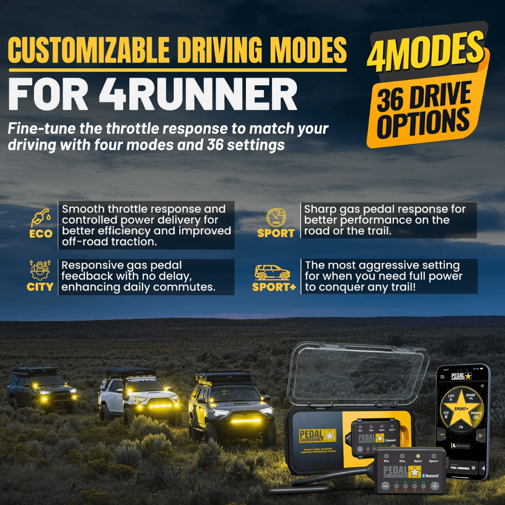 Pedal Commander® eliminates throttle lag by modifying the stock throttle signal, giving you instant power delivery. You’ll have total control over your 4Runner’s gas pedal response with four adjustable modes—Eco, City, Sport, and Sport+. With 36 sensitivity settings in total, you can adjust throttle response for better fuel efficiency, off-road precision, or max performance. Plus, the Anti-Theft mode disables the gas pedal via the app for extra security. Pedal Commander® is the ultimate upgrade for a better, more responsive 4Runner.