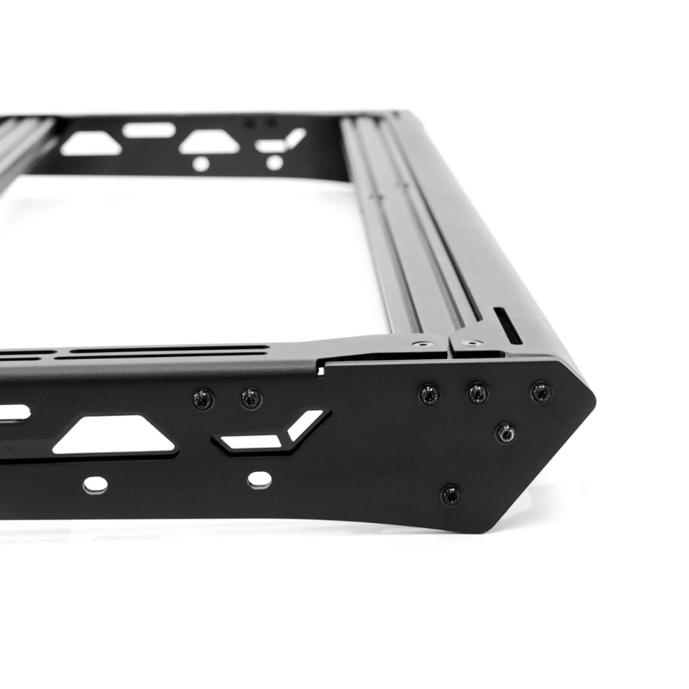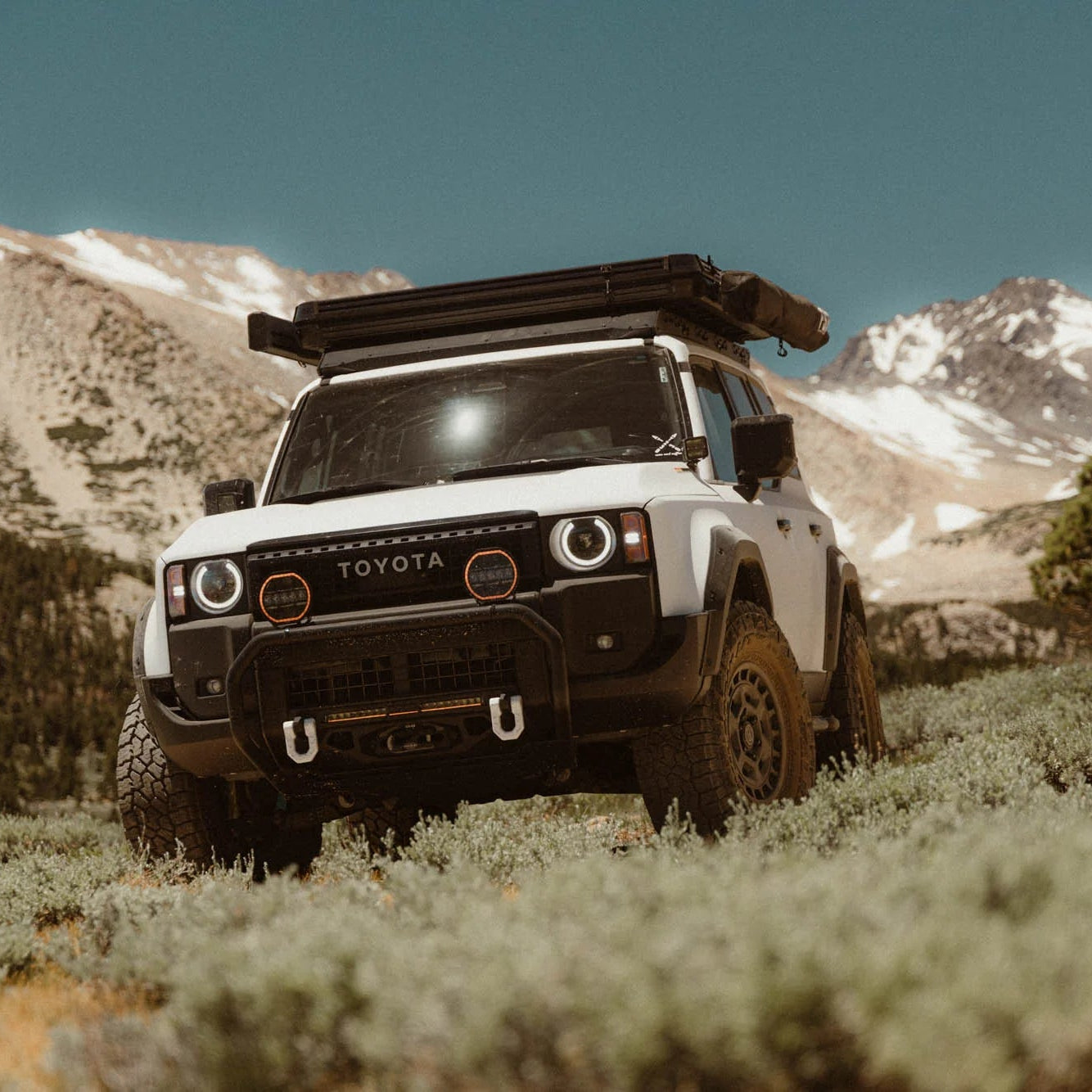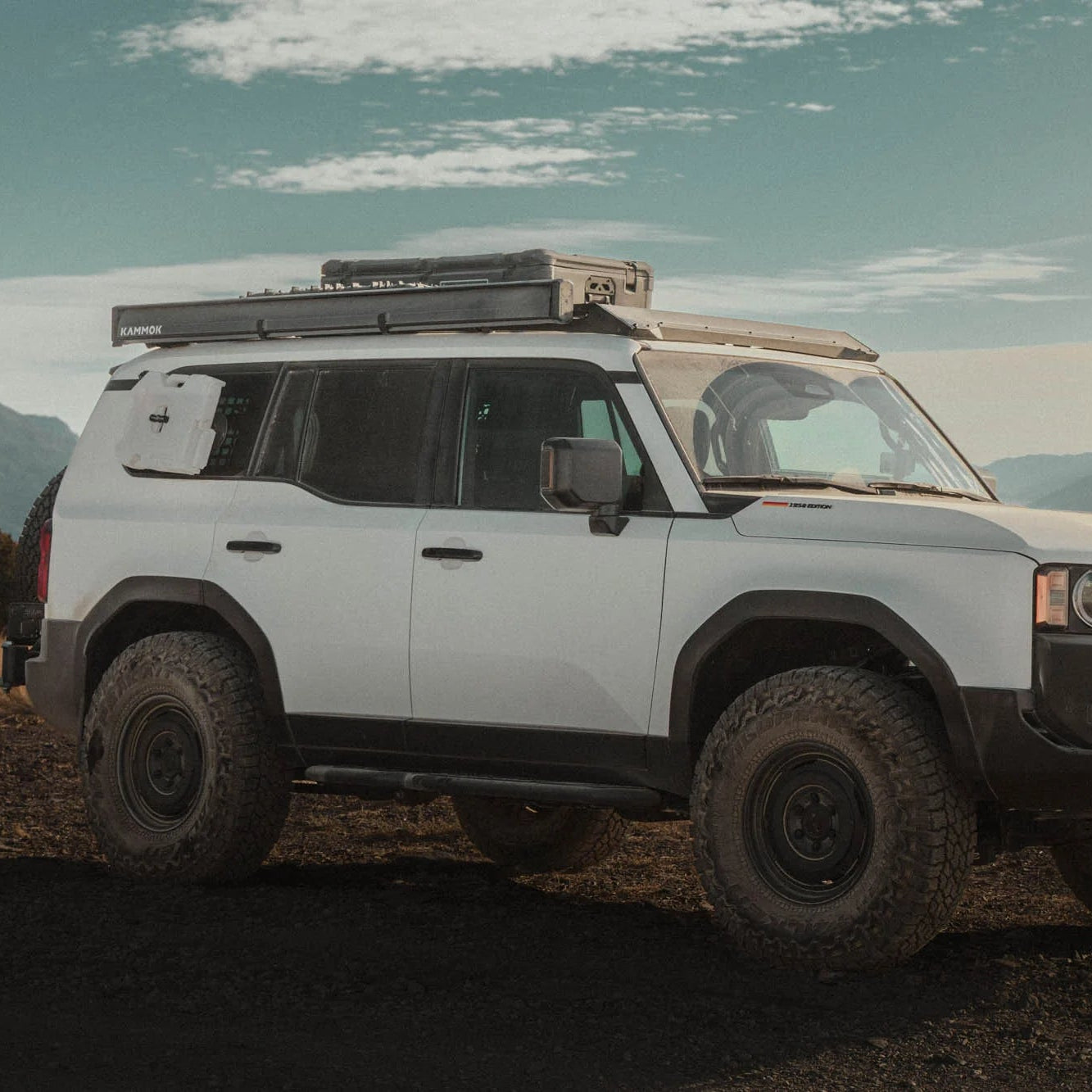 Our Lexus GX 550 Spec Series Roof Rack provides secure storage solutions for your off-road and overland gear. The steel mounting feet and nine 80/20 T-slot cross bars are designed to withstand the added weight from storage boxes, tools, adventure equipment, and other necessary supplies. The removable rear styling fins allow for flush mounting of roof top tents, awnings, and other large camping solutions. Our rack features integrated mounting points along the cross bars for attaching and tying down a wide range of gear using M6 T-nuts. The roof rack’s ultra low-profile fitment and angular wind deflector helps minimize wind noise.