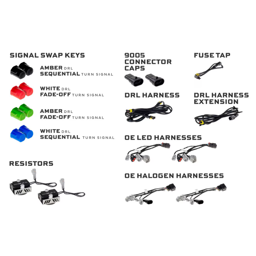 ✔ Accessories 2x Halogen Adapters, 2x OEM LED Adapters, 2x Magnet Mount Resistors, 2x High Beam Connector Caps, 1x DRL Harness, 1x DRL Harness Extension, Fuse Tap Hardware